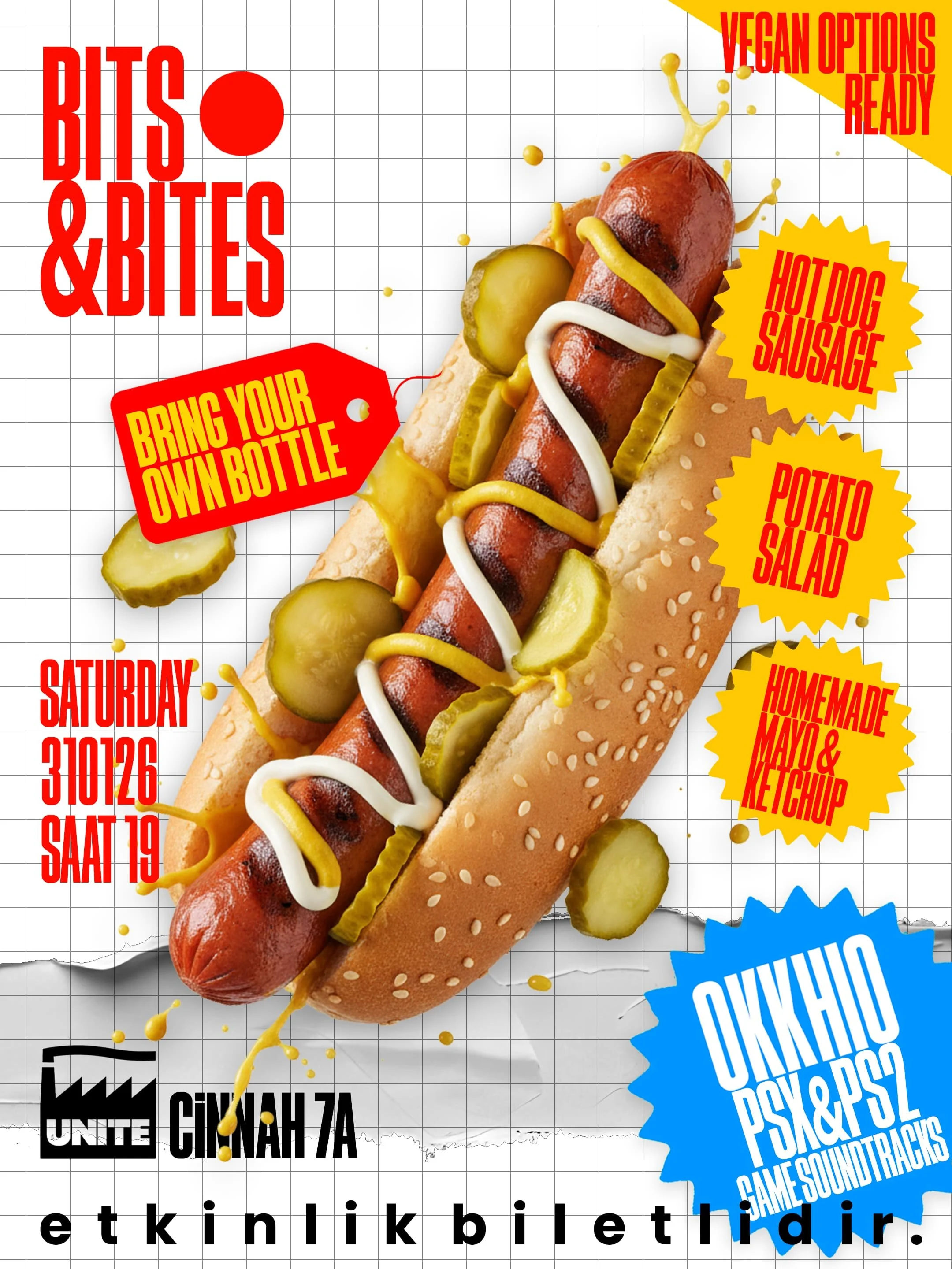 Biz müzikle ruhunuzu doyururken, Bits & Bites mutfağı da karnınızı doyuracak: Efsane Hot Dog & Patates Salatası Ev yapımı Ketçap & Mayonez Vegan seçenekler hazır!