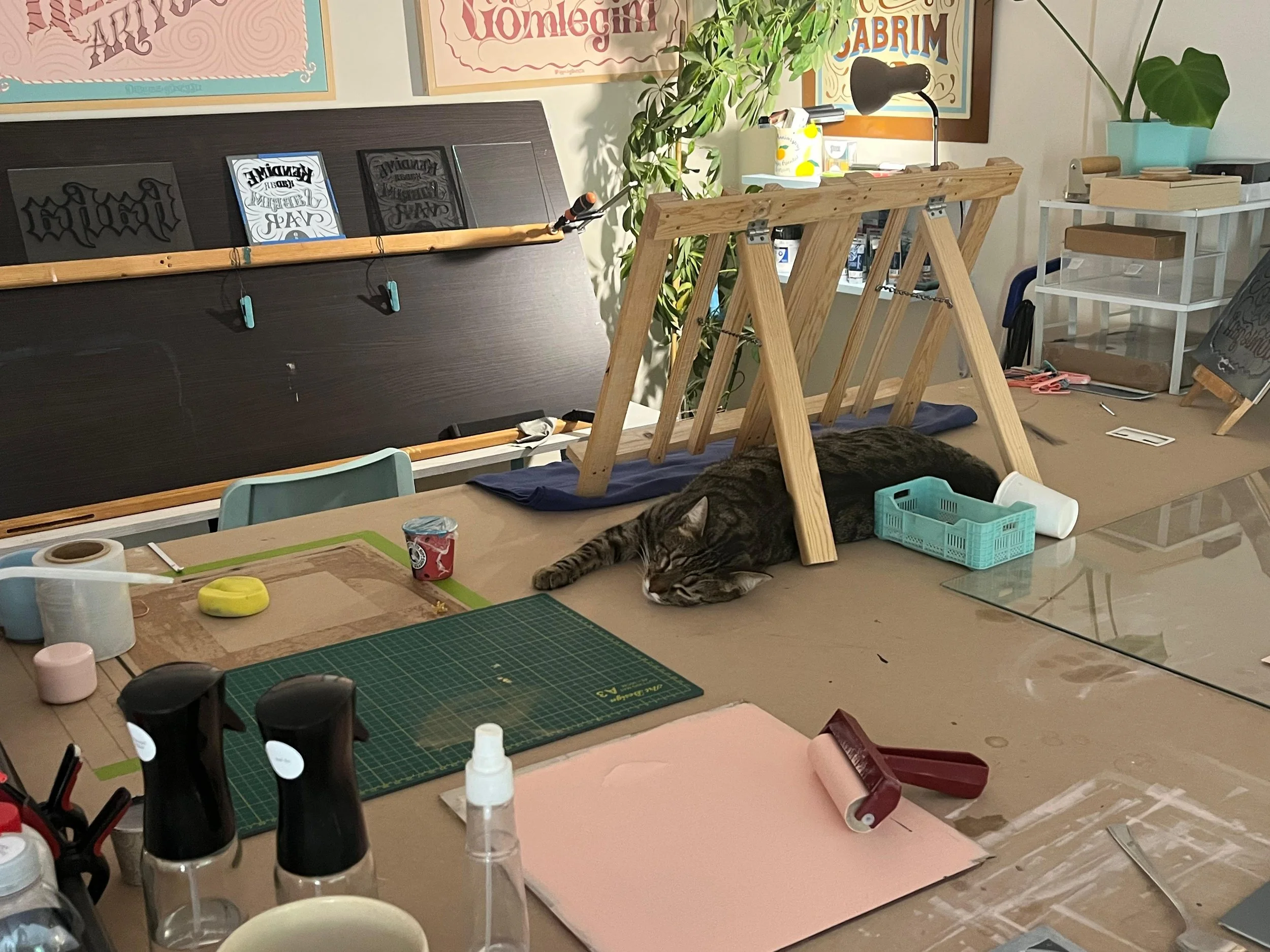 Linol baskıyla ilgilenmeye böyle bir senedir falan başladım. Ondan önce, ve hala da öyle, genelde bu fırça tabelacılığı pratikleri: fırçayla, boyayla; cam altı ya da ahşap, metal gibi çeşitli yüzeyler üzerine üretim yapıyorum. Ama temelinde, ben kendimi harfleme sanatçısı olarak tanımlıyorum, yani yazı tasarımı ve üretimi üzerine. Biraz da edisyonlu iş yapmak için linol baskıya merak saldım. Kendi tasarımlarımı üretip, onları da erişilebilir ürünler olarak sunuyorum.