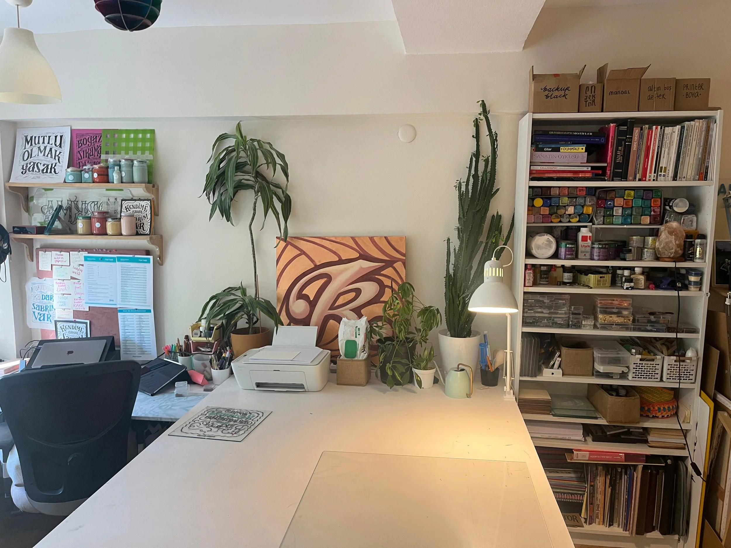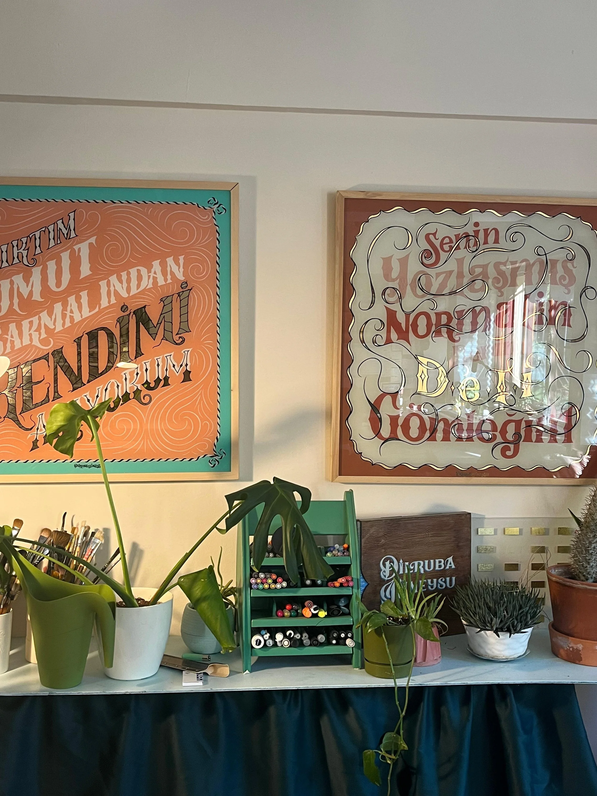 Yüksek lisansa başlamadan önce de aslında benim defterlerim hep doluydu; kamyon arkası yazılarını çok seviyordum. Onları not alıp defterime tam sayfa çiziyordum. Sonra yüksek lisansa başladığımda kaligrafiyle ilgilenmeye başladım. Çalışırken de kaligrafi uçları, kalemler, fırçalar alıp kendi kendime çalışıyordum. Sonra yüksek lisansa başladığımda taktım yani. Günde sekiz saat yazı yazmaya başladım. O zaman anladım, en sevdiğim şeyi buldum herhalde.