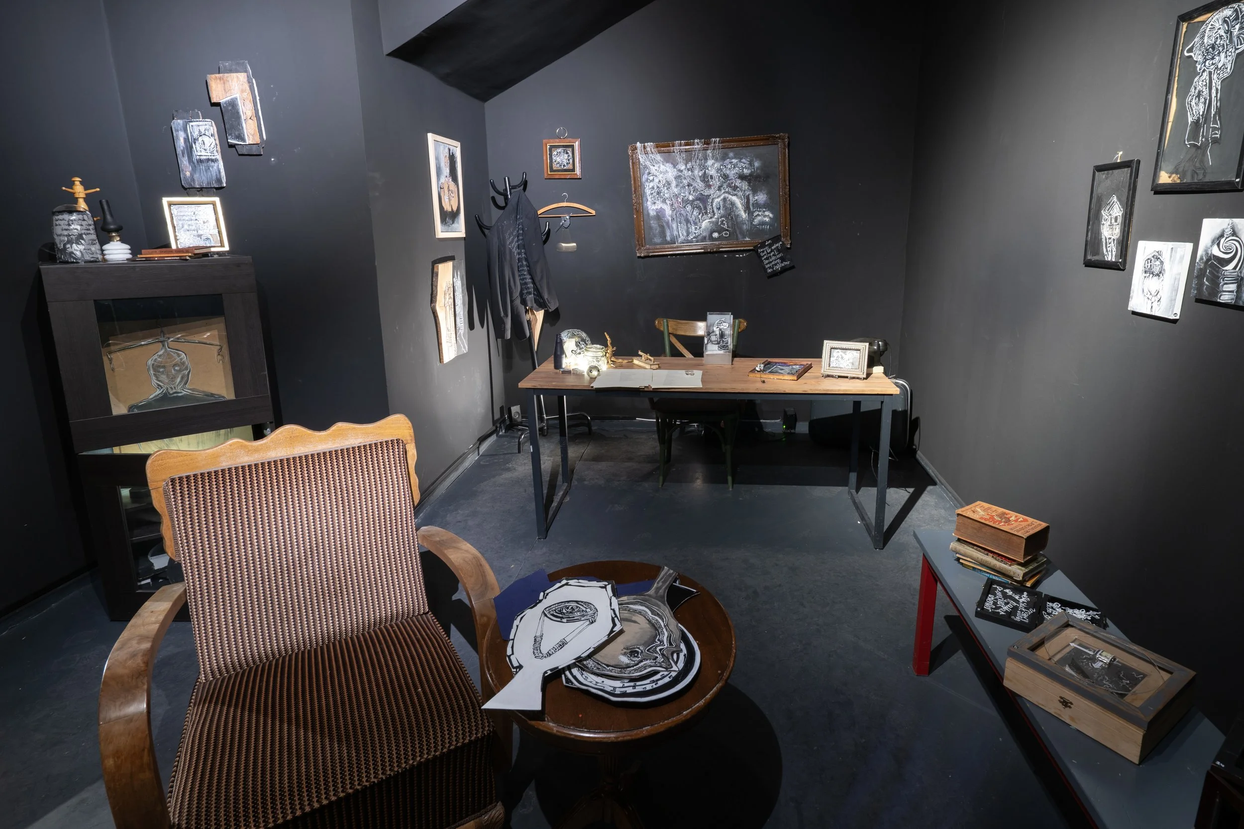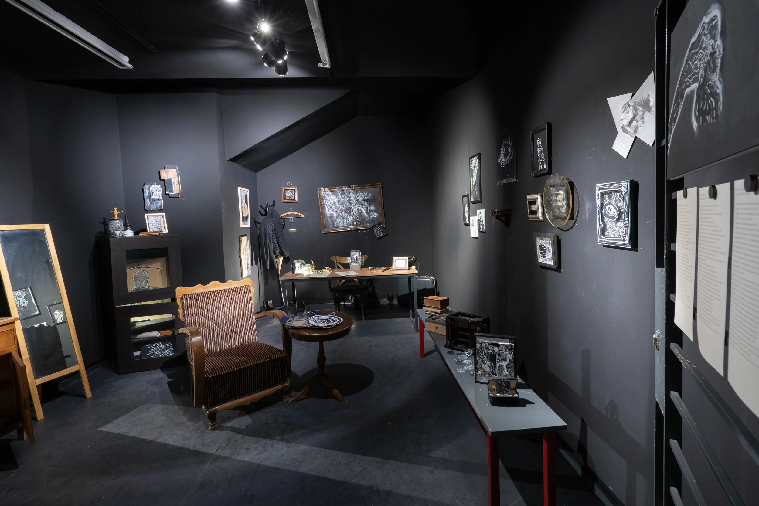 Zihin odası olarak tanımlayabileceğimiz mekân, basit bir yaşam alanında olabilecek en temel eşyalar ve sanatçının işlerinden oluşan bir sahne gibi kurgulanmıştır. Üretimi zamana yayılmış olan bu işler, sanatçının çeşitli tekniklerle uyguladığı illüstrasyon ve kendi şiirlerinden alınmış metinlerle yorumladığı buluntu nesnelerden oluşur. Gerçek işlevini bilmediğimiz ancak tanıdık gelen bu nesneler; kişisel deneyim ve toplumsal baskının karışımıyla biçimlenen bireyin tutum ve hatıralarının metaforudur. Bireyin yaşamında toplumsal ve bireysel alanın muğlak dengesi üzerine odaklanır.